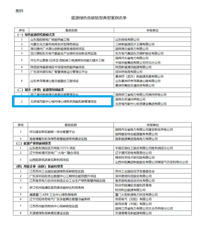 近日,國家能源局發(fā)布了關于公布能源綠色低碳轉型典型案例名單的通知,在全國首次評選出23個典型案例。由北投集團和國網北京通州供電公司聯合申報的“北京城市副中心城市綠心綠色供用能和碳管理項目”,作為具有示范性、典型性的新能源利用項目,經過初審推薦、專家評選、案例核查、名單公示等環(huán)節(jié),從全國各省級能源主管部門審核推薦的150余個案例中脫穎而出,成功入選國家能源綠色低碳轉型典型案例,這也是北京市轄區(qū)內唯一入選案例。